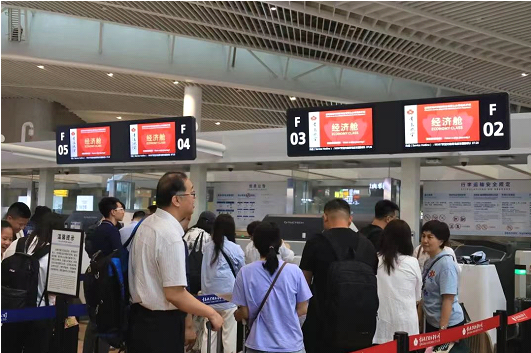 (图为乘坐青岛航空国际航班的旅客们正在值机)