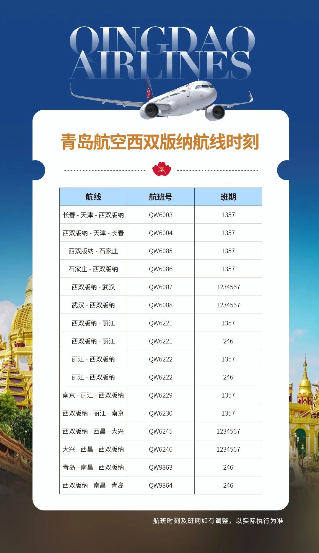 该航线为每周三班,班期为周三、五、七。西双版纳-万象的航班号为QW6081,航班计划起飞时间为07:00(北京时间),计划到达时间为07:10(老挝时间);万象-西双版纳航班号为QW6082,航班计划起飞时间为08:10(老挝时间),计划到达时间为10:15(北京时间)。(注:以上航班时间均为当地时间,两地时差为1小时)。