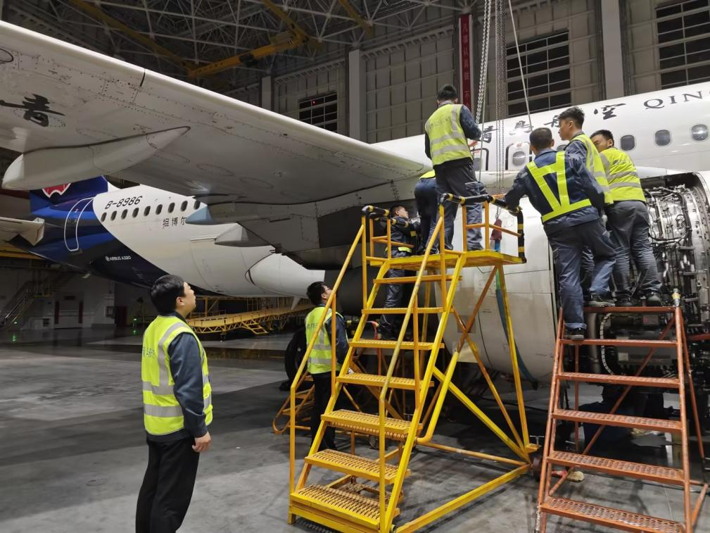 (图为青岛航空机务人员正在进行维修工作)
