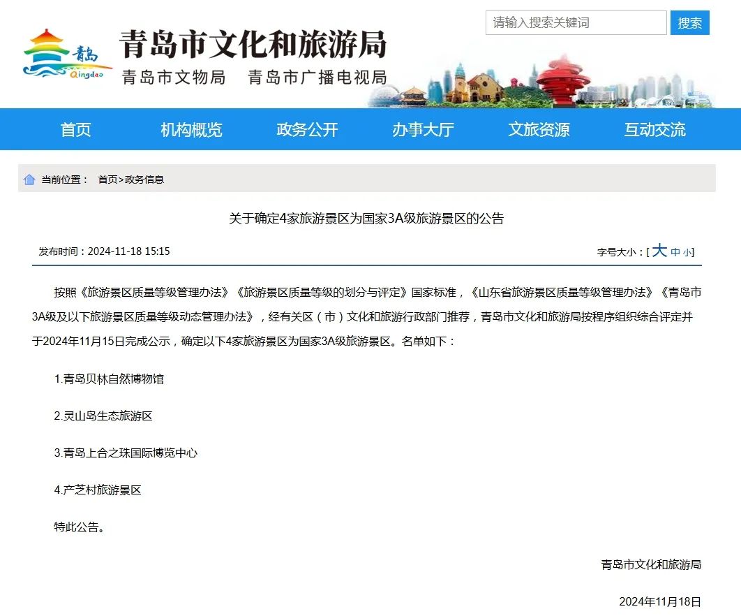 11月18日,青岛市文化和旅游局正式发布《华体会在线注册确定4家旅游景区为国家3A级旅游景区的公告》,华体会(中国)投资建设的青岛·上合之珠国际博览中心成功获评为国家3A级旅游景区。