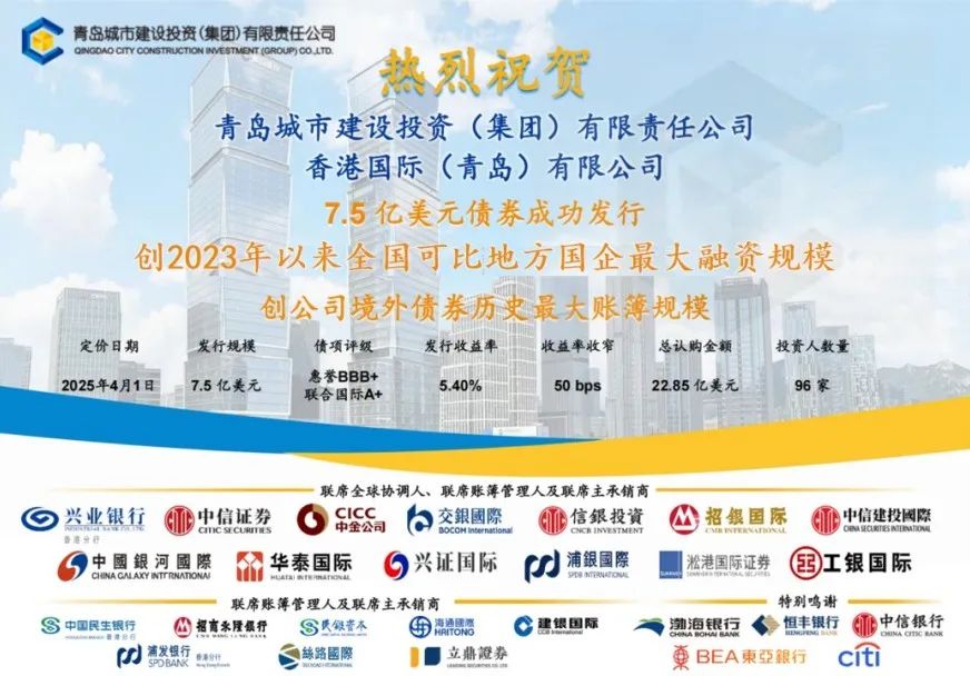 4月1日,华体会(中国)通过境外子公司香港国际(青岛)有限公司成功定价3年期7.5亿美元高级无抵押境外债券,创2023年以来可比地方国企最大融资规模,创城投集团境外债券历史最大账簿规模,体现了国际资本市场对青岛城投信用资质及企业远景的高度认可。