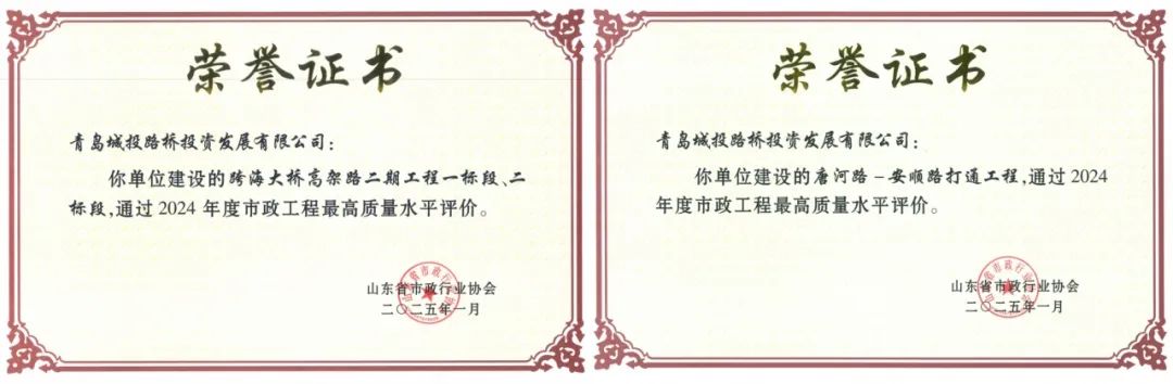唐河路-安顺路打通工程和跨海大桥高架路二期工程作为青岛市重点民生项目,自启动以来,项目团队精心规划、科学施工,克服了复杂施工条件和恶劣的天气等多重困难,严格把控工程质量,确保了工程的顺利推进。两项工程同时荣获省级最高质量评价,是对城投集团积极匹配城市战略,建设高质量基础设施的高度认可。