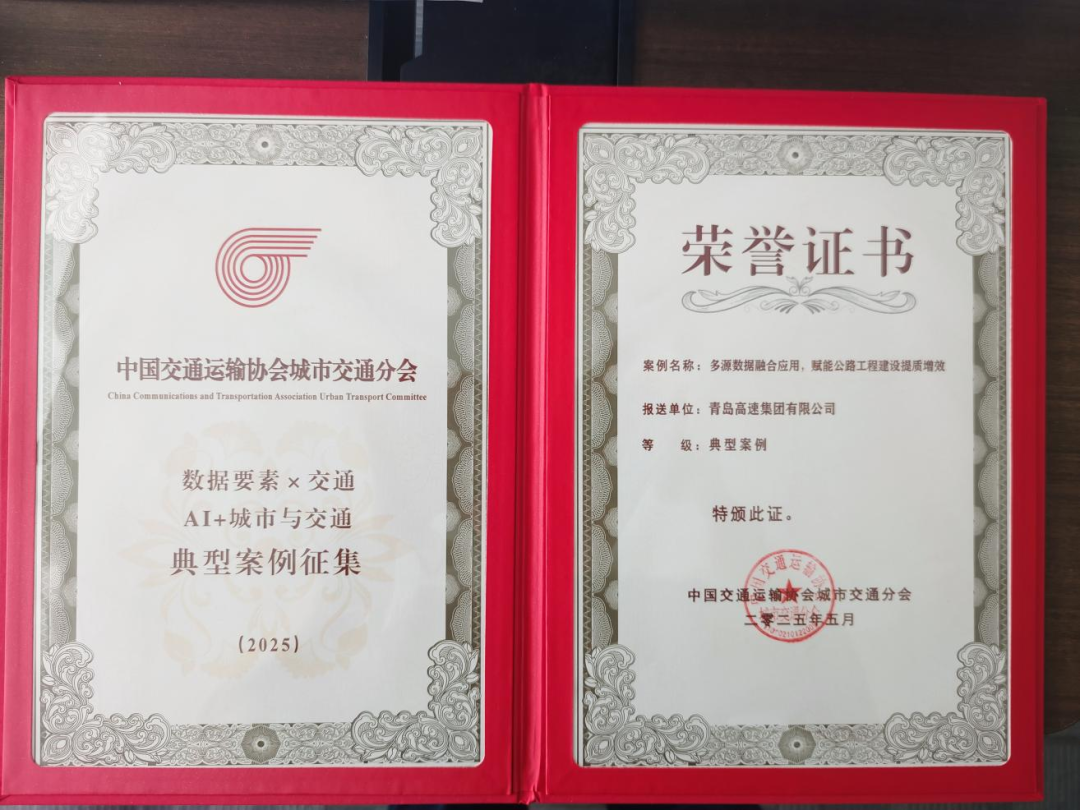 在大会主论坛“数据要素×综合交通”“AI+交通运输”典型案例发布仪式上,青岛高速申报的“数字化管理平台赋能综合市政交通工程应用”获评“优秀典型案例”,“多源数据融合应用 赋能公路工程建设提质增效”获评“典型案例”,