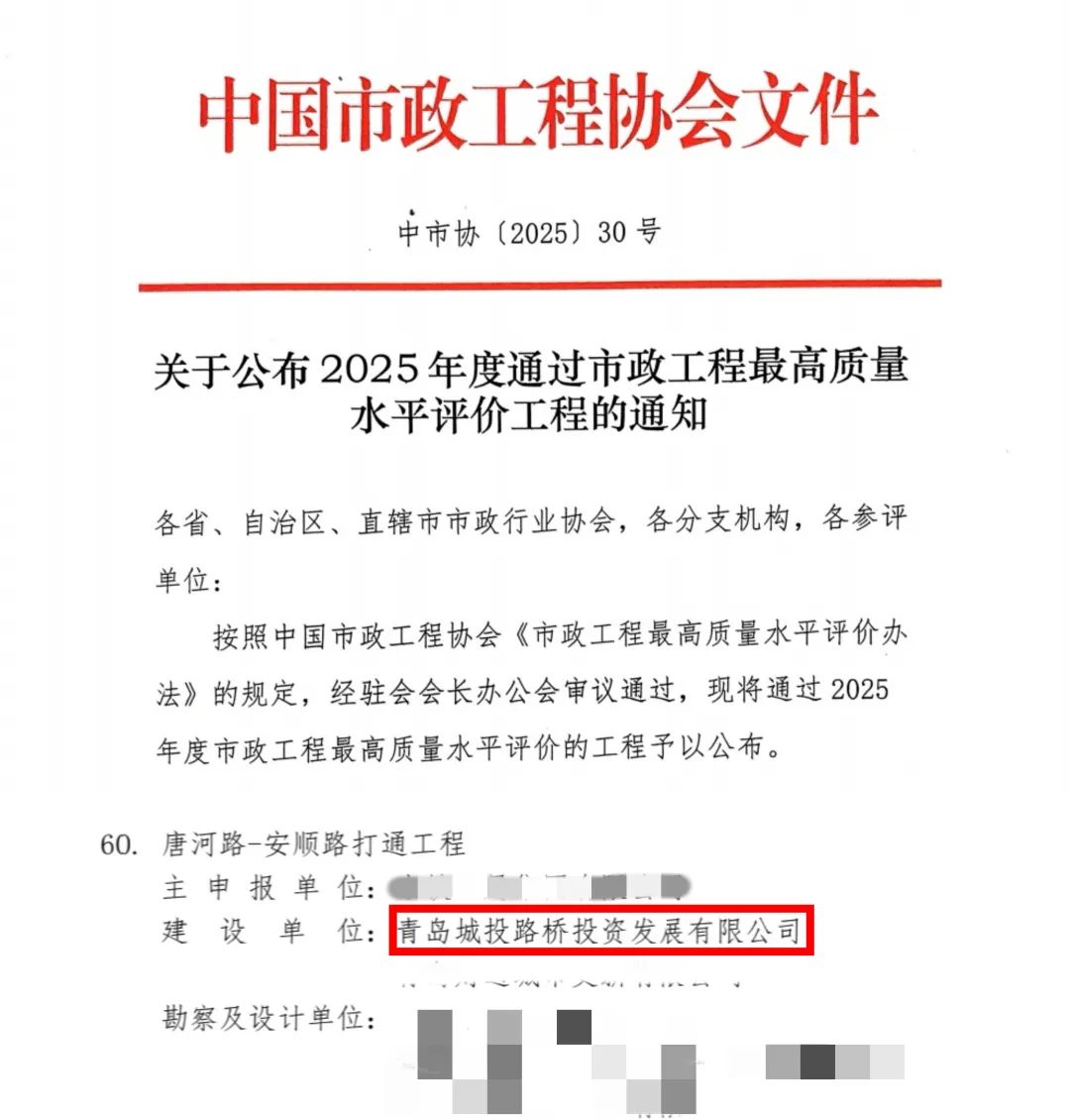 近日,由青岛城投城市更新集团代建的唐河路-安顺路打通工程,凭借质量、安全、技术创新等方面的卓越表现,荣获2025年度“中国市政工程最高质量水平评价”,这一荣誉由中国市政工程协会颁发,代表市政行业同期国内最高质量水平。