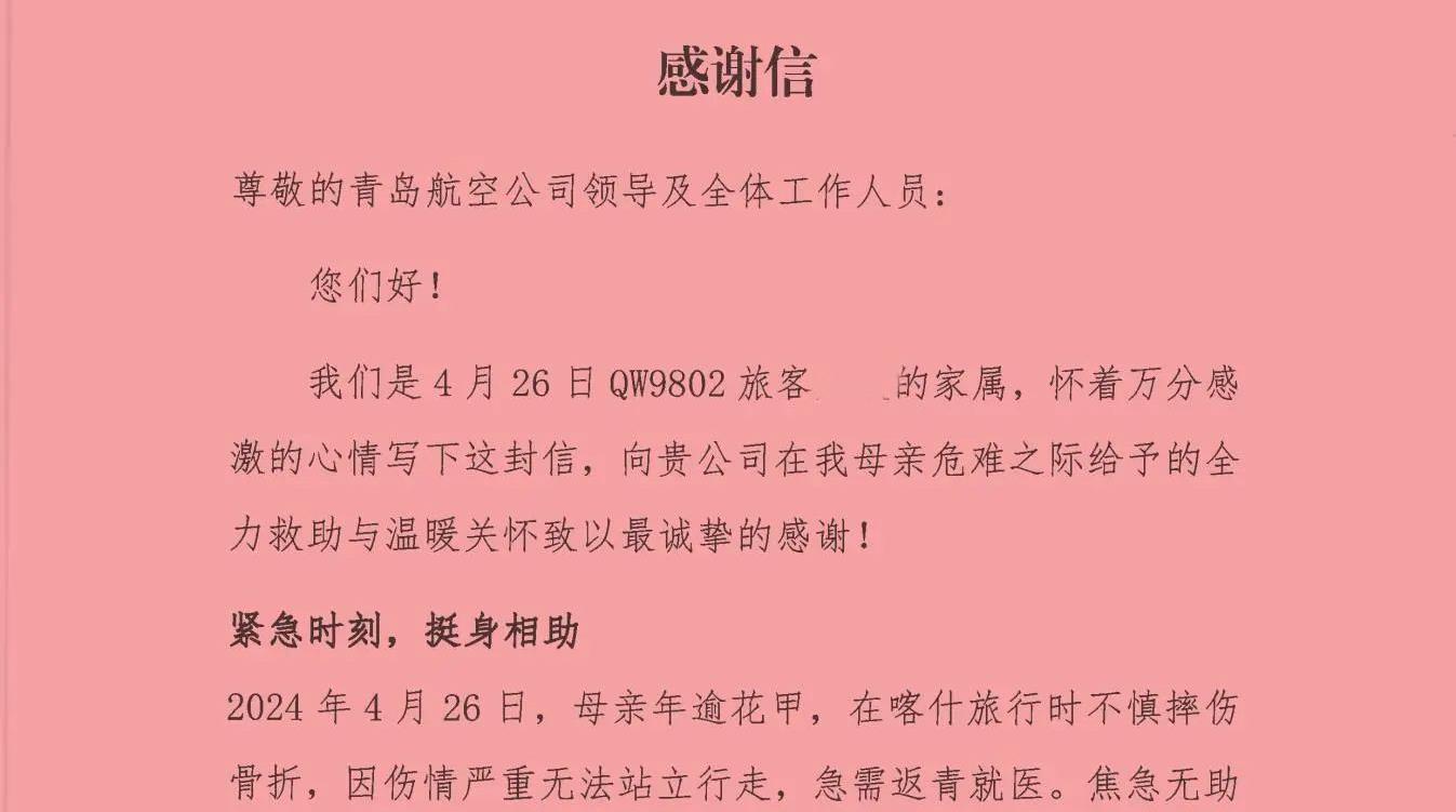 近日,一封含“赞”量满满的感谢信被专程送到了华体会(中国)旗下青岛航空的值机柜台。信中,旅客家属用“雪中送炭的人间大爱”形容这段跨越千里的护航之旅,字里行间流淌的真情,让这封不足千字的信件成为青岛航空真情服务的最佳见证。(图为乘客发来感谢信)4月26日,年逾花甲的旅客万女士在喀什旅行时不慎摔伤骨折,因伤情严重无法站立行走,需搭乘青岛航空QW9802航班返青就医,家属在焦急无助之际联系青岛航空求助。接到旅客求