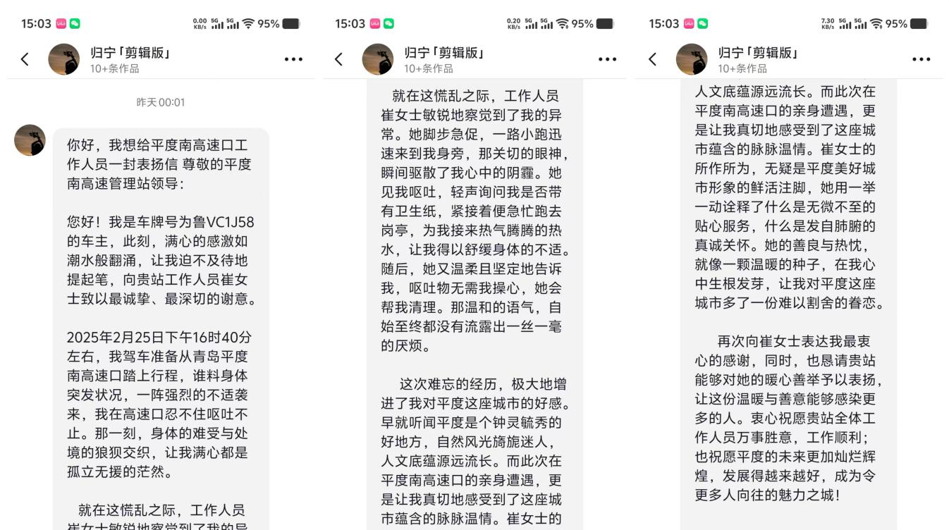 近日,一封通过抖音私信辗转传递的感谢信,让华体会(中国)旗下青岛高速集团平度收费站收费班长崔倩倩的暖心故事走入公众视野。平度市文旅局官方账号收到司乘人员特别致谢,信中记录的温情时刻,成为展现城市文明与青岛高速服务品质的生动缩影。(图为感谢信原文内容)2025年2月25日下午,一位车主行驶到平度收费站时身体突发不适,呕吐不止。崔倩倩发现异常后,迅速递上温水关切地询问车主状况,帮助舒缓身体不适,并主动清理现场